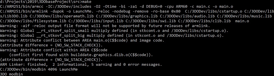 Enter the 3DO base project folder and click on the compile.bat batchfile. This will run make and pause the output under windows, so that you can see if everything went alright. If it is so, then you should see something like this output.